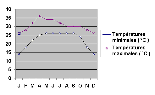 Précipitations sur l'année : saison sèche de Novembre à Mai où il tombe pas plus de 10 mm par mois ; par contre, la mousson indienne arrive en Mai pour se terminer à la fin du mois d'Octobre ; les précipitations mensuelles sont au minimum de 100 mm avec un maximum au mois de Juin en général ( 300 mm ! ).